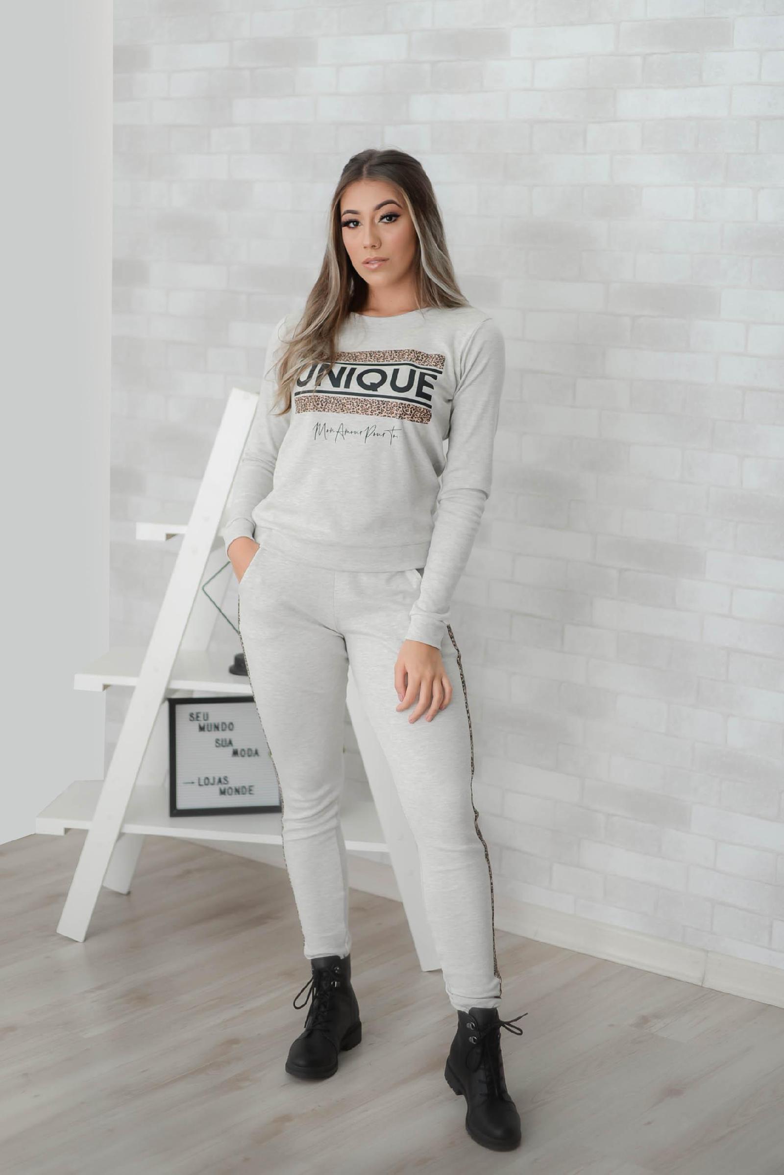 Detalhes: Conjunto calça e moletinho com detalhe de onça 85% algodao 15%poliester